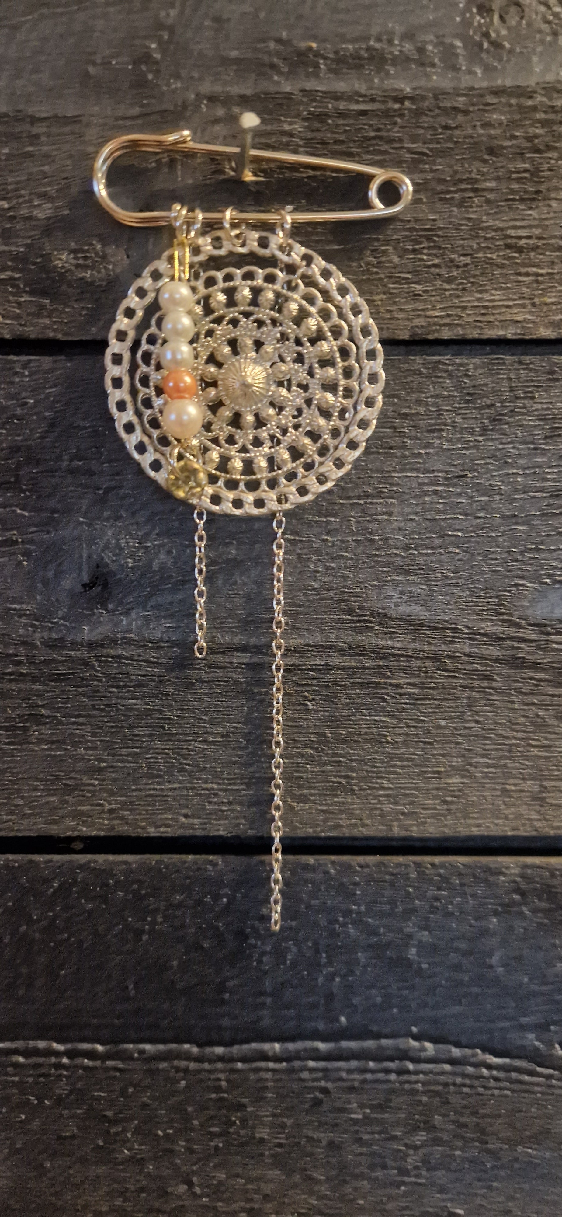 Broscher "mĂ„nros" Ă€r gjord pĂ„ ett runt silverfĂ€rgat smycke med hĂ€ngande kedjor och pĂ€rlor.đŸ”