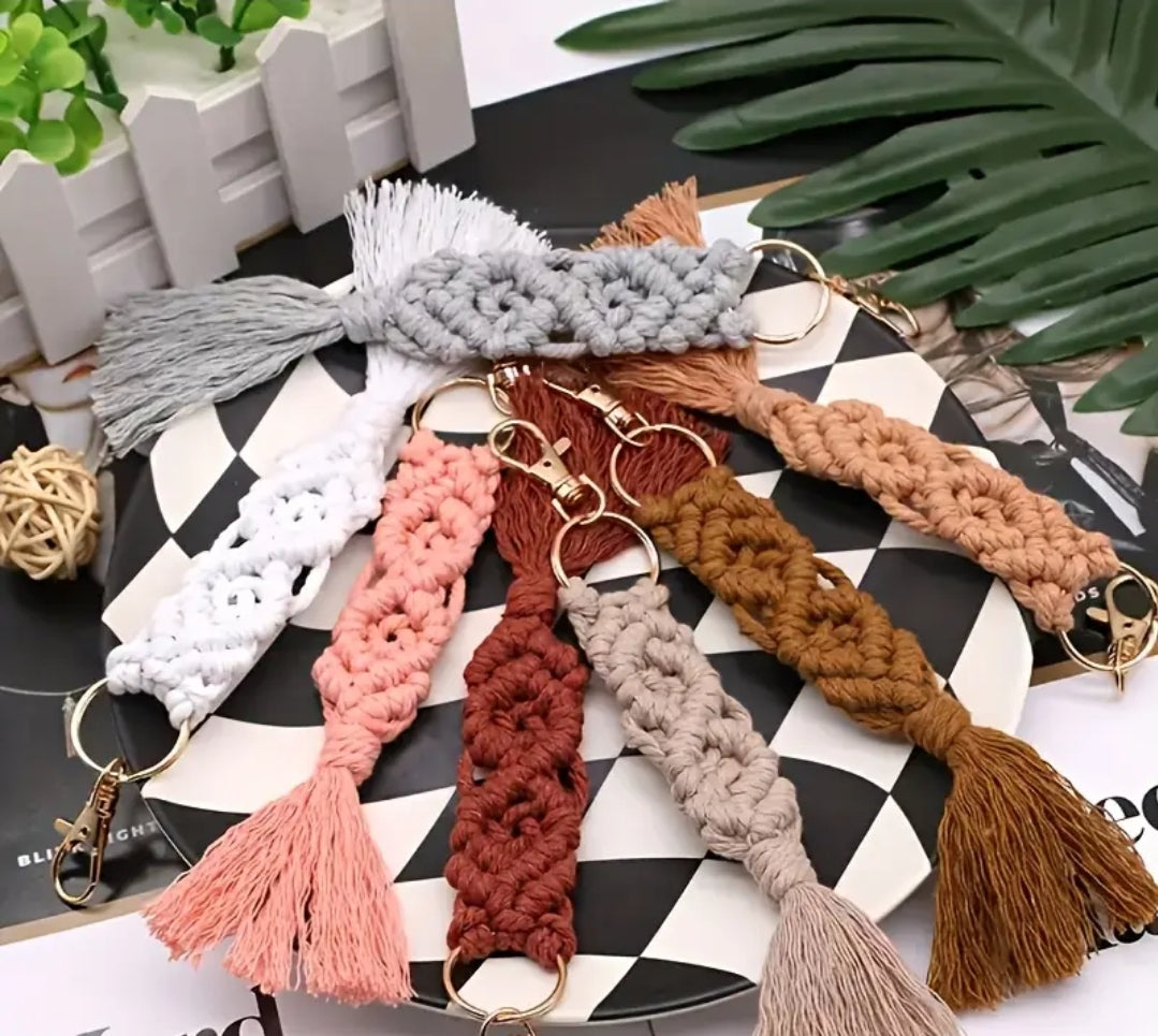 Varje nyckelring Ă€r omsorgsfullt knuten för hand med vackra, slitstarka trĂ„dar i olika fĂ€rger â allt frĂ„n mjuka naturtoner och nyanser som drar blickarna till sig.